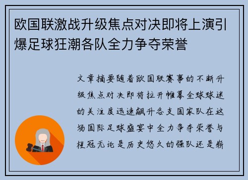 文章摘要:随着欧国联赛事的不断升级,焦点对决即将拉开帷幕,全球球迷的关注度迅速飙升。各支国家队在这场国际足球盛宴中,全力争夺荣誉与桂冠。无论是历史悠久的强队,还是崭露头角的新兴势力,都将通过这场激烈的...
