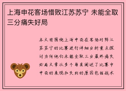 本文将围绕上海申花在客场对阵江苏苏宁的比赛进行详细分析,重点探讨为何他们未能全取三分,最终痛失好局。文章从多个角度阐述了比赛中申花的表现和失利的原因,包括战术执行、关键球员的发挥、比赛节奏的掌控和球队...